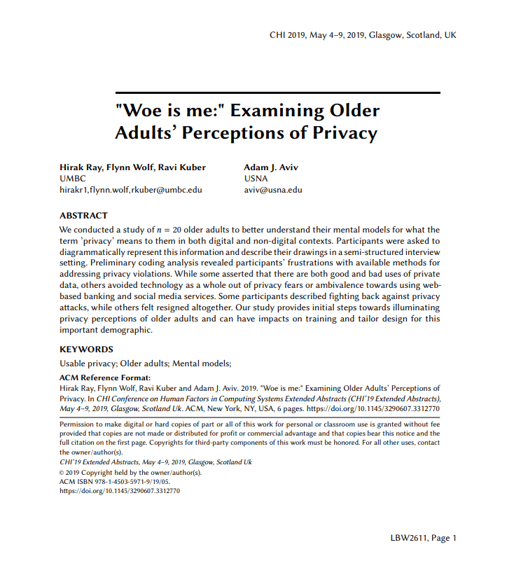 – Ray, H., Wolf, F., Kuber, R., & Aviv, A. J. (2019, May). ” Woe is me” Examining Older Adults’ Perceptions of Privacy. In Extended Abstracts of the 2019 CHI Conference on Human Factors in Computing Systems (pp. 1-6).)
